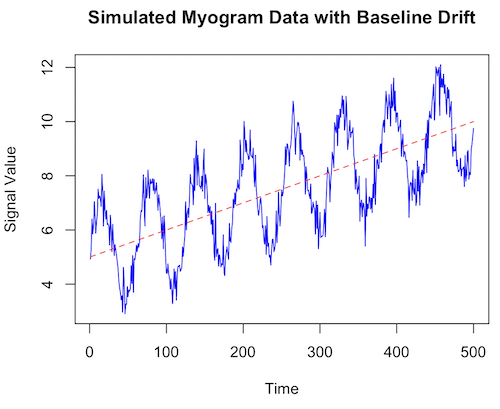 Drift, col = 'red', lty = 2) # Overlay the drift line legend("topleft", legend = c("Simulated Myogram", "Baseline Drift"), col = c("blue", "red"), lty = c(1, 2), cex = 0.8) # ylim = range(myogram_data, baseline_drift)