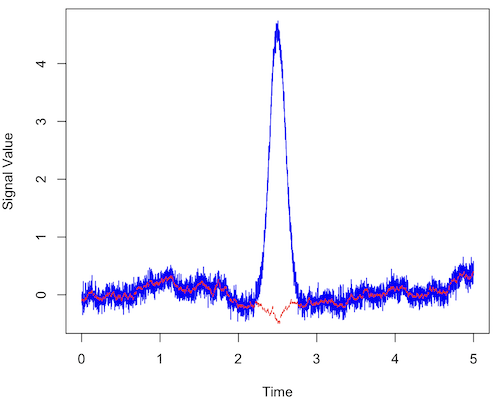 xlab = “Time”, ylab = “Signal Value”, ylim = range(myogram_data, baseline_drift))